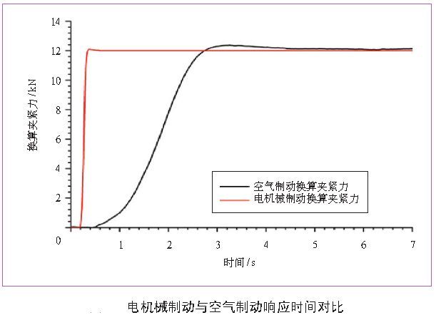 EMB 系统极大地提高了轨道车辆的制动性能。在目标制动力的响应时间上,采用电动机驱动的EMB 系统相比于空气制动系统缩短了70% 以上,参见下图。