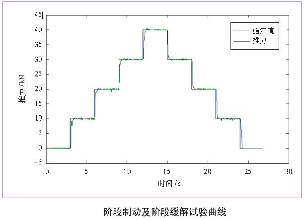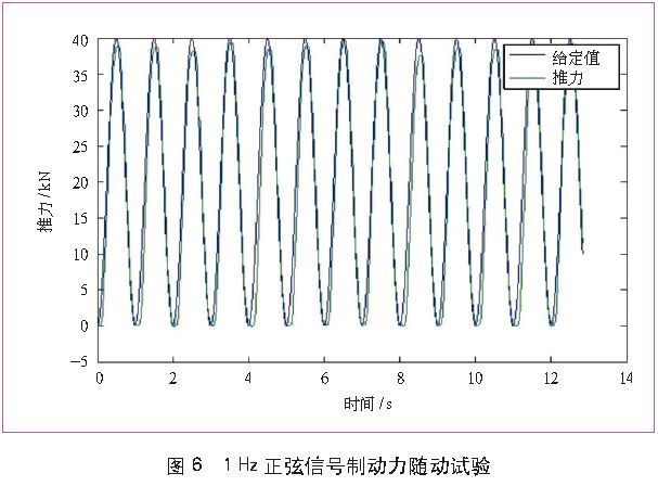 相比于空气制动系统的强非线性(制动缸压力精度20 kPa)和大时滞特性(响应延迟在1 s 以上),电机械制动系统完全弥补了上述2 点的不足,见下图 中阶段制动与阶段缓解过程中电机械制动制动缸的推力与制动指令的跟随性。试验台试验结果证明,电机械制动系统不但制动力控制精度高,而且其响应速度能够跟随频率按1 Hz正弦变化的目标指令,如下图所示。