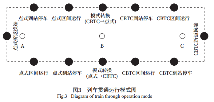 对于线路II列车来说,其在B-C段常用控制方式为CBTC级别控车,在A-B段常用控制方式为点式级别控车。列车运行方式和模式转换如图3所示。