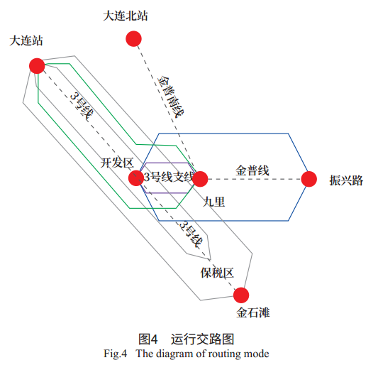 地铁3号线从大连站至金石滩站,开行大连站金石滩、大连站保税区的大小交路。3号线支线从开发区至九里站,开行开发区九里站交路,且与3号线共同开行大连站九里站的长交路。金普线新建段从九里站至振兴路站,且与3号线支线贯通运行,开行振兴路至开发区的列车交路。运行交路如图4所示。
