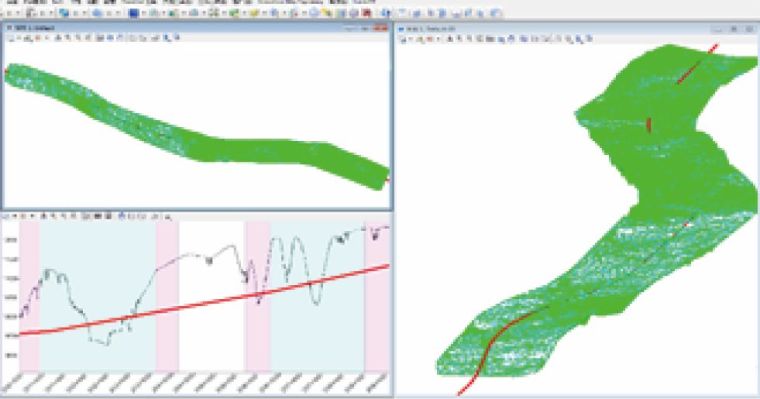 在铁路工程设计中,线路平纵是所有专业空间定位的基准,线路数据能否被下游专业直接利用是实现BIM正向设计的关键。PowerCivil提供的线路平纵设计工具可直接在地形、地质模型上进行线路设计。首先在平面视图中设计线路平面,软件会沿线路剖切地形模型生成地形纵剖面,在此基础上进行线路纵断面设计,最后在三维视图中会自动拟合出线路空间曲线,见图4。