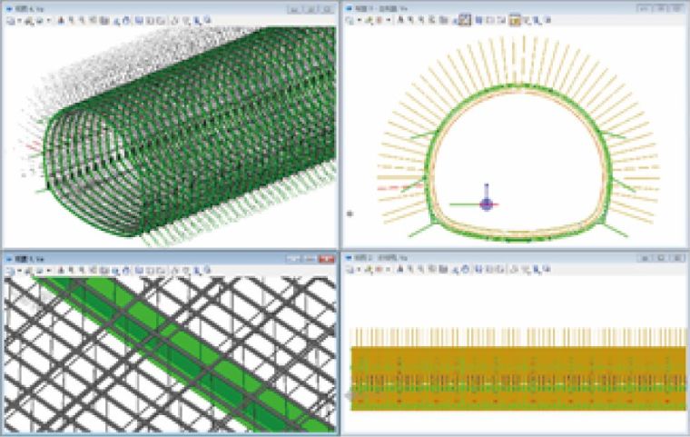 隧道结构设计主要包括隧道锚杆,钢筋网片,钢架,二次衬砌钢筋等。可利用结构设计软件ProStructures完成,该软件支持中国本地化技术规程设置。在钢筋设计过程中,可调用常用钢筋类型或自定义钢筋类型。在钢结构设计过程时,当选择钢构件连接形式并设定相关参数后,可自动生成钢结构连接件。设计完成的隧道锚杆、钢筋、钢架模型见图6。
