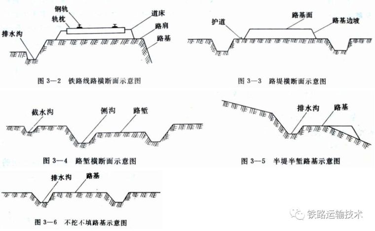 因地形和断面形式的不同可分为路堤、路堑、半堤半堑、半路堤、半路堑及不填不挖式路基六种。