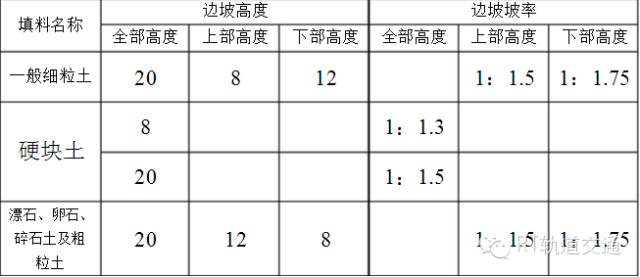路基边坡的坡度应根据土质、土层情况及地质与水文地质条件决定,一般路堤边坡的坡度如下表:
