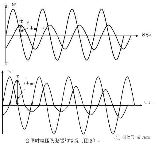 在交流电路中,磁通总是落后电压u90相位角。如果在合闸瞬间,电压正好达到最大值时,则磁通的瞬间值正好为零,即在铁芯里一开始就建立了稳态磁通,在这种情况下,变压器不会产生励磁涌流。当合闸瞬间电压为零值时,它在铁芯中所建立的磁通为最大值(m)。可是,由于铁芯中的磁通不能突变,既然合闸前铁芯中没有磁通,这一瞬间仍要保持磁通为零。因此,在铁芯中就出现一个非周期分量的磁通fz,其幅值为m。见图B
