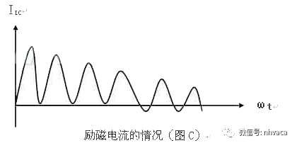 这时,铁芯里的总磁通应看成两个磁通相加而成,铁芯中磁通开始为零,到1/2 T时,两个磁通相加达最大值,达到2。因此,在电压瞬时值为零时合闸情况最严重。励磁涌流的大小和衰减速度,与合闸瞬间外加电压的相位,铁芯中剩磁的大小和方向、电源容量、变压器的容量及铁芯材料等因素有关。励磁涌流的大小和衰减速度见图C