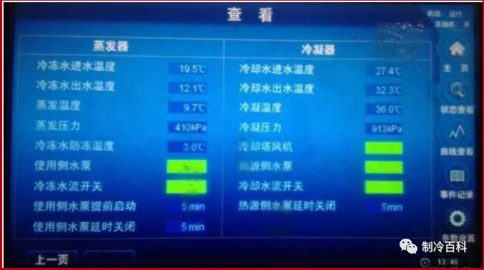 冷凝器清洗重点在于关注:冷冻水进、出水温,冷却水进、出水温,冷凝压力、蒸发压力。我们可以计算端温差,将冷凝压力、蒸发压力换算成对应冷凝饱和温度与蒸发饱和温度,若触摸屏上可查询冷凝温度与蒸发温度,该值即为对应的冷凝饱和温度与蒸发饱和温度。如下所示: