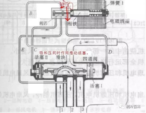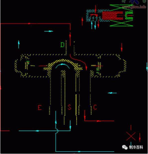 2. 当主滑阀运动到中间位置时,四通阀的E、S、C三条接管相互导通,压缩机排出的冷媒从四通阀D接管直接经E、C接管流向S接管(压缩机回气口),使压力差快速降低,形成瞬时串气状态(中间流量状态)。