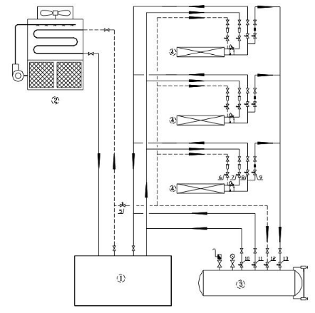 1、压缩机组 2、冷凝器 3、排液桶 4、蒸发器 5、冲霜主电磁阀6、冲霜电磁阀 7、供液电磁阀 8、回气电磁阀 9、回液电磁阀 10、排液电磁阀 11、减压电磁阀 12、加压电磁阀 13、落液电磁阀