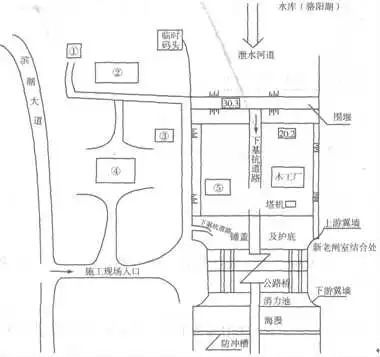 根据施工需要,现场布置有混凝土拌合系统、钢筋加工厂、木工厂、临时码头、配电房等临时设施。其平面布置示意图如下,图中①、②、③、④、⑤为临时设施(混凝土拌合系统、油库、机修车间、钢筋加工厂、办公生活区)代号。