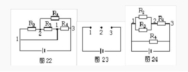 仍以图13为例,设电流由A端流入,B端流出,先撤去R2,由图16可知R1、R3有电流通过。再撤去电阻R1,由图17可知R2、R3仍有电流通过。同理撤去电阻R3时,R1、R2也有电流通过由并联电路的特点可知,R1、R2和R3并联,再与R4串联。