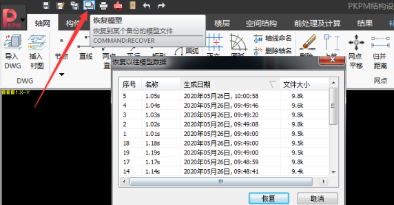 恢复模型时,可以将上述文件中任意一个,拷贝到新的文件夹,将后缀名改为.JWS,即可恢复相应时间的模型。也可在程序中直接用【恢复模型】的命令进行模型的恢复。