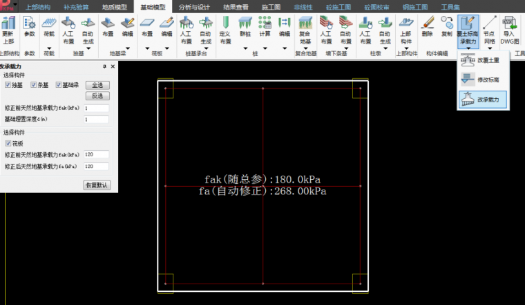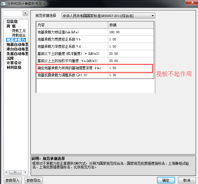 A:筏板地基承载力的修正参考地基规范5.2.4条,需要注意的是修正深度的取值程序取室外地面与筏板底标高的高差(独基需手动填写)。