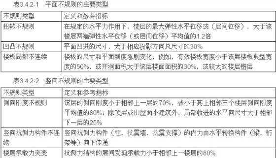 1 混凝土房屋、钢结构房屋和钢-混凝土混合结构房屋存在表3.4.3-1所列举的某项平面不规则类型或表3.4.3-2所列举的某项竖向不规则类型以及类似的不规则类型,应属于不规则的建筑。
