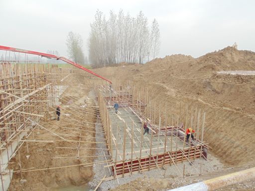 混凝土采用搅拌站集中拌制混凝土,混凝土罐车运输。冬季混凝土的搅拌时间应比常温时延长50%。混凝土拌和物出机后,应及时运到浇筑地点。混凝土的养护选用蓄热法养护:一层塑料薄膜和二层草袋保温。冬季拆除模板时,混凝土表面温度和自然气温之不应超过20℃。