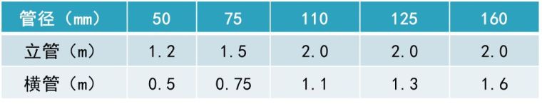 d.支管安装:首先剔出吊管孔洞或复核预埋件是否合适。清理现场,按需要支搭操作台。将预制好的支管按编号运至场地。清除各粘接部位的污物及水分。将支管水平初步吊起,涂抹粘接剂,用力推入预留管口。根据管段长度调整好坡度。合适后固定卡架,封闭各预留管口和洞口;排水塑料管道支吊架间距应符合下表规定:
