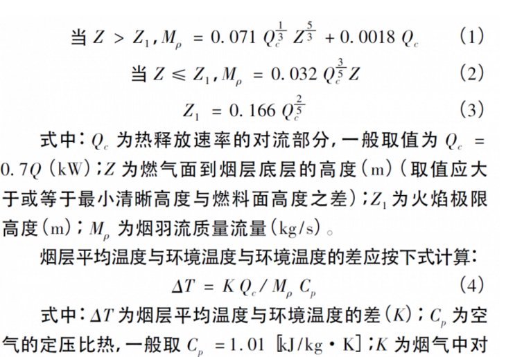 根据新规范,公共建筑、工业建筑中空间净高大于6m的场所,其每个防烟分区排烟量应根据场所内的热释放速率以及式(1)~式(6)计算,且不应小于表1中的数值。
