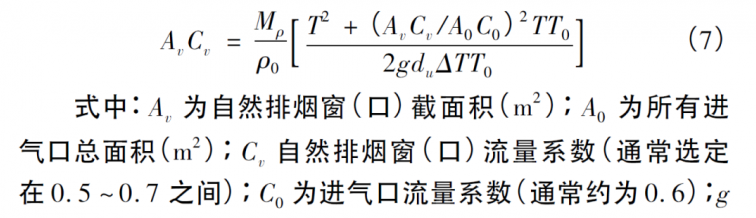 与机械排烟不同,在排烟量与自然排烟窗( 口) 的面积之间的关系,可按式( 7) 计算。式中可以看出,当排烟量M确定时,自然排烟窗( 口) 的面积主要受db、AvCv /A0C0的影响。
