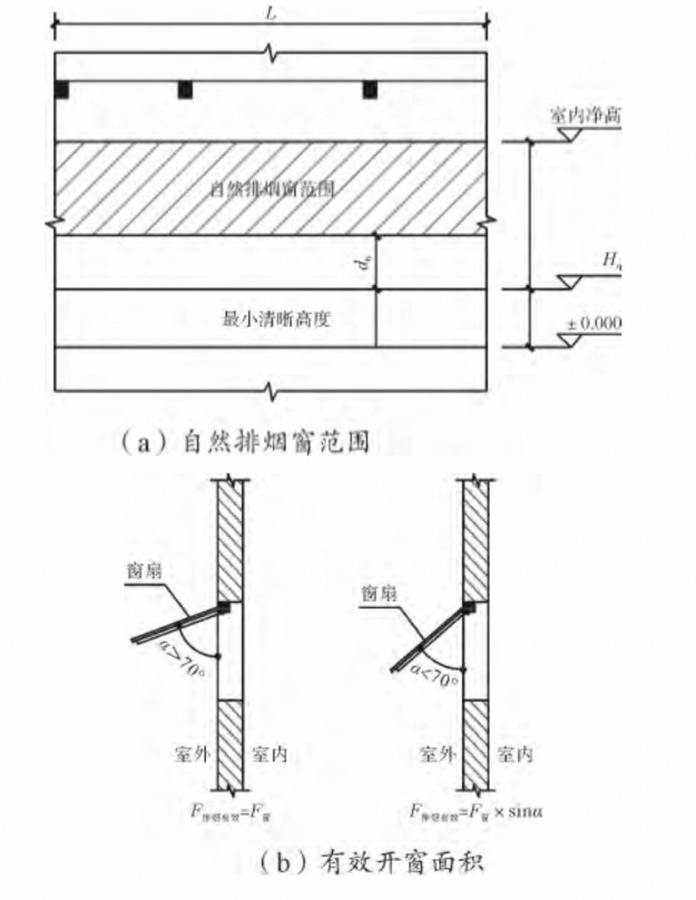 然而对于自然排烟,新规范同样要求排烟口必须设置于储烟仓内,见图4( a) 。不同形式的排烟窗有效开窗面积需要按一定的规则进行计算,对于建筑中最常采用的上悬窗,其有效开窗面积的计算规则见图4( b) 。