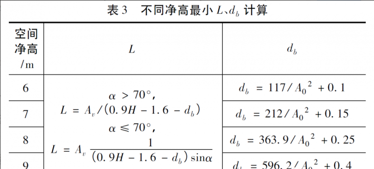 下面给出了不同净高下的L、db、A0等参数间的等式关系供设计时快速选用( 表3) 。