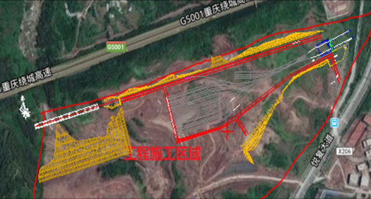 我们再来看看项目的周边环境,项目被夹在两个山丘之间,场地东西两端位于两山丘的山坡上,南侧为场内回填边坡,北侧为G5001重庆绕城高速公路,场地周边多为林地。