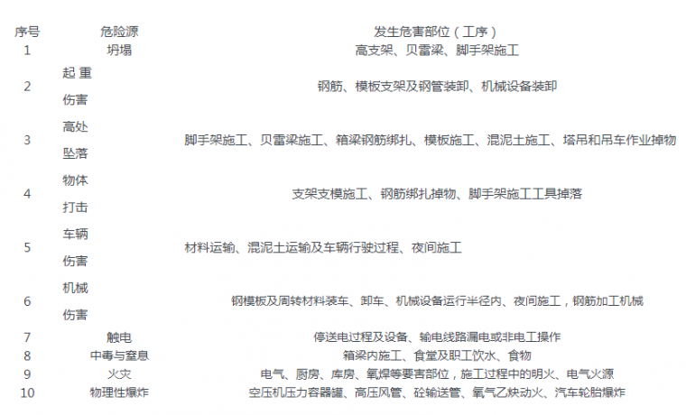 面对山坡陡峻、跨越山谷(野水沟)的地形,项目空心墩高度达到59.5m,箱梁支架搭设超高、超长,高空空作业施工风险性极大。为确保施工安全,项目根据工程设计,结合地形地貌等工程特点,进行了危险源分析: