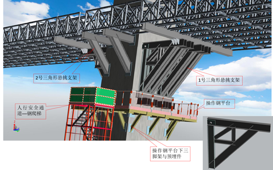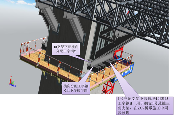 其中以ZC6/7号墩三角形悬梁挑支架搭设为例。为解决钢管立柱超高和控制贝雷梁跨度不大于24米,在最高墩ZC6、ZC7桥墩上采用悬挑三角支架支承箱梁,从BIM模型可知,该部位由3部分组成:即顺桥向1#悬挑三角支架、横桥向2# 三角支架,以及安拆三角支架用的临时钢平台等三部分组成。