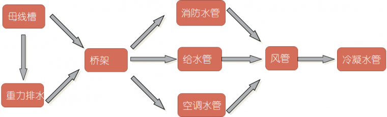 (1)避让原则:大的通风管道、大的高压桥架、母线以及无压排水管道是优先考虑对象,其它管线可适当绕行,但也不能无限制的变弯。空间排布基本:梁下200mm空间设置强、弱电桥架,梁下200~400mm设置消防水管布管空间,梁下400mm~700mm设置空调专业管道,对于设有排烟系统的空间,通常为400mm~900mm设置为空调、防排烟风管布管空间。