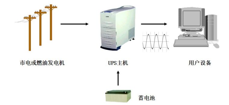 当市电输入正常时,UPS 将市电稳压后供应给负载使用,此时的UPS就是一台交流式电稳压器,同时它还向机内电池充电;当市电中断(事故停电)时, UPS 立即将电池的直流电能,通过逆变器切换转换的方法向负载继续供应220V交流电,使负载维持正常工作并保护负载软、硬件不受损坏。