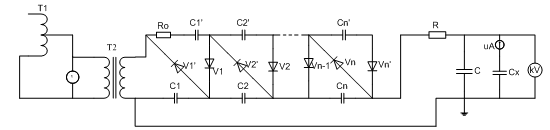T2--升压变压器,采用武汉研创高科生产的YDJ系列试验变压器,输入电压380V,输出电压300kV(具体电压的高低根据所选择的串级直流高压发生器的级数来定),变压器容量要大于10kVA。