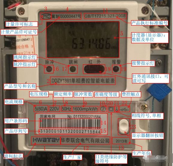 11) 产品执行标准,一般为国家标准,如GB/T17215.321-2008,表示该电能表的制造执行该国家标准,该国家标准是2008年颁布实施的。