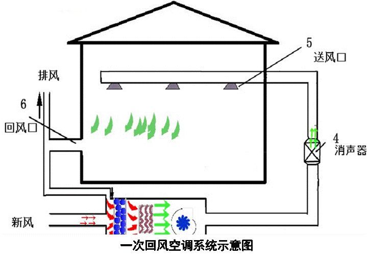 一次回风空调系统:空调系统的回风与室外新风在喷淋室(或空气冷却器)前混合一次称一次回风式系统。