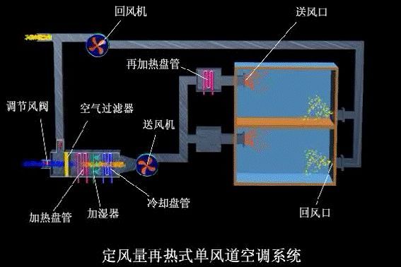 一次回风再热送风:再热式系统是指处理到机器露点状态的空气经过再加热然后才送入室内的的空调系统。