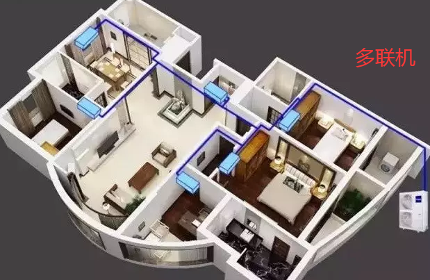 多联机特点:一拖多结构就是一个室外机连接多个室内机,室外机台数少,相比之下室外机体积较大,导致它在一般公寓房预留的空调位上没办法进行安装,不得以需要安装在阳台上。