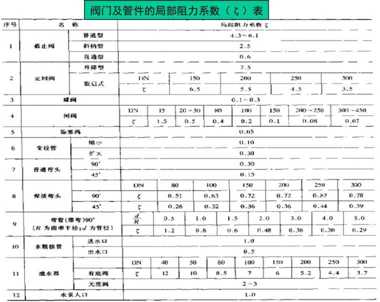 根据各管段的流量,由下表确定各段管径。由上图可查出比摩阻R,和各管件的局部阻力系数,便可确定各管段的总阻力。