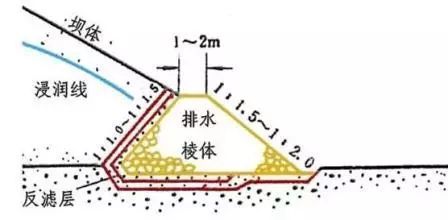 棱体排水又称滤水坝趾,它是在下游坝脚处用块石堆成的棱体。棱体排水是一种可靠的、被广泛采用的排水设施。它可以降低浸润线,防止坝坡冻胀,保护下游坝脚不受尾水淘刷且有支持坝体增加稳定性的作用。但石料用量大,费用较高,与坝体施工有干扰,检修也较困难。