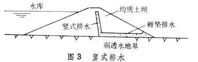 坝内排水包括褥垫排水层、网状排水带、排水管、竖式排水体等。褥垫排水是沿坝基面平铺的由石块组成的水平排水层、外包反滤层。当下游无水时,它能有效地降低浸润线,有助于坝基排水,加速软粘土地基的固结。缺点是对不均匀沉降的适应性差,易断裂,且难以检修。当下药水位高过排水设备时,降低浸润线的效果将显著降低。