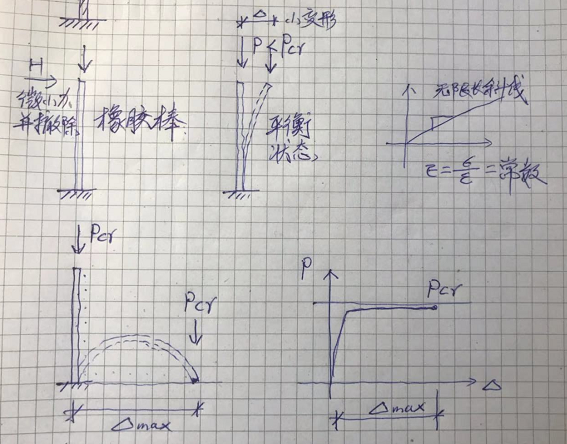 文章稳定问题(一)分析了完全弹性时受压杆稳定欧拉临界荷载问题。可以形象的想象一根橡胶杆,即使失稳后被压的杆端着地了,也不会破坏,欧拉临界力就是这样得出来的,见下图: