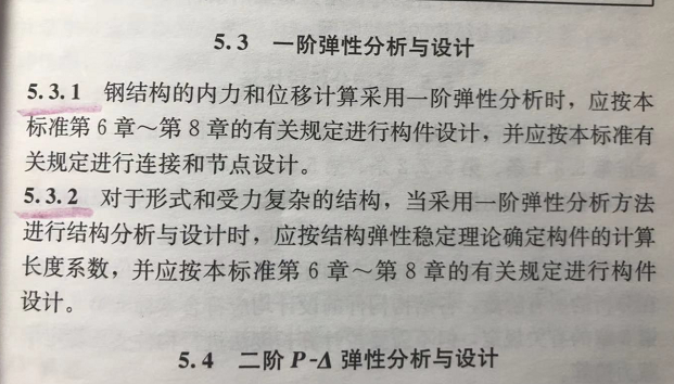新钢标5.3.1和5.3.2 (见下图)的规定一阶分析时要用6~8章的进行构件计算,6~8章是几十年来一批又一批的前辈们总结并列入规范的传统的方法。