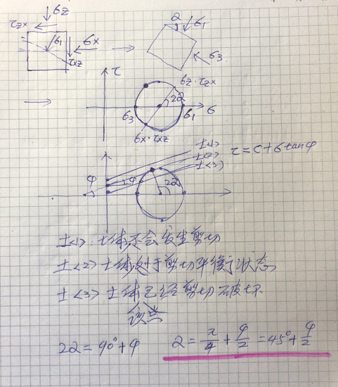如果我们假设一个如下图的护坡,土自重产生垂直应力,护坡墙提供水平应力,这两个垂直面正好没有剪应力,可以当成主应力。那么该土体的滑切面与水平面的夹角就是地基基础设计思考与实践土的抗剪_12