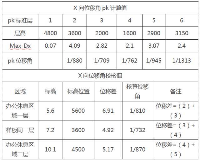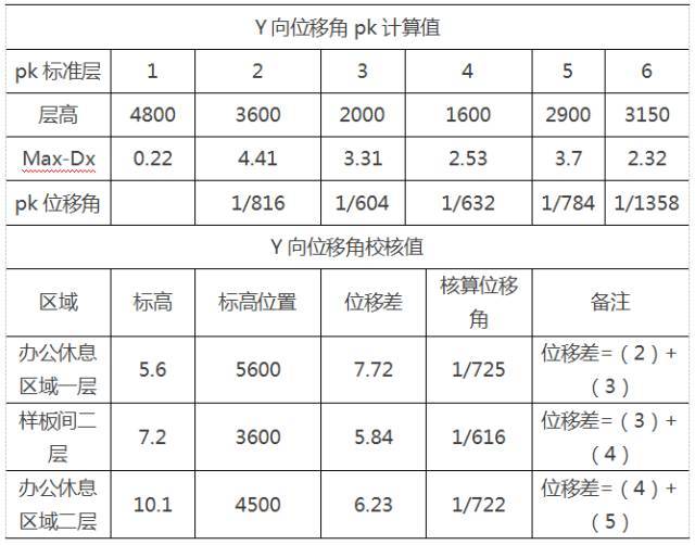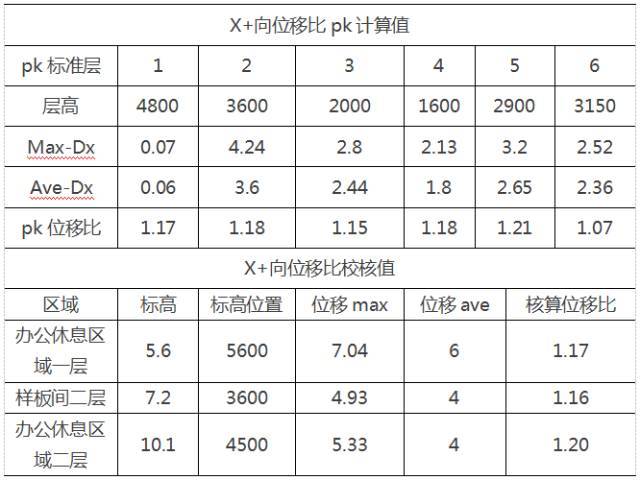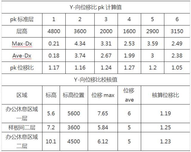 这里还要清楚一点,错层结构建模中人为的增加了大量的标准层,造成计算中跨层部分位移角和位移比结果失真,不能区别真实楼层与计算楼层的关系,故必须对实际高度进行手算补充校验。详细介绍可参照《建筑结构设计问答及分析》第3.6.3条,针对本工程需要对标高5.6m(休息办公区域顶板处,层高5.6m)、标高7.2m(二层样板间顶板处,层高3.6m)和标高10.1m(二层办公区域顶板处,层高4.5m)进行校核,位移角校核见下表1,位移比校核见表2(鉴于篇幅限制,表2只列出X+和Y-两个方向中位移比最大的一组数据)。