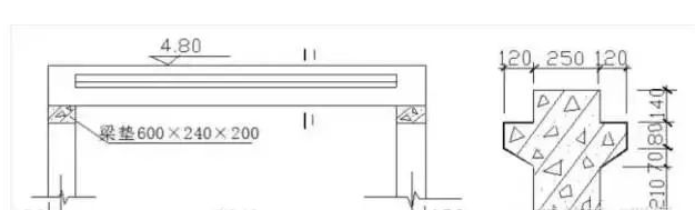 [例10-16]某现浇花篮梁,梁端有现浇梁垫,尺寸如图107所示。木模板,木支撑,计算梁模板、支撑工程量,确定定额项目。