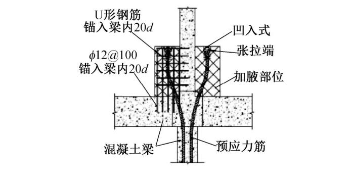 根据整体施工安排,将施工平台划分9个施工区域,按分区顺序进行预应力施工。梁预应力筋主要有曲线筋和底部直线筋;单根预应力束采用直径为120mm波纹套管。为减少张拉端张拉过程中的局部破坏,根据计算对张拉端进行加腋以加强,如图2所示。