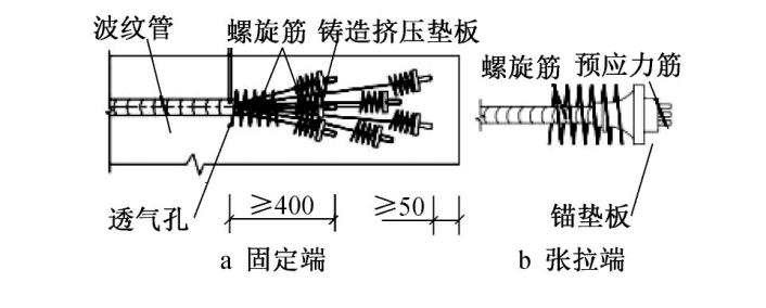 在预应力筋固定端、张拉端按要求放置螺旋筋,承担预应力局部压力(见图4)。