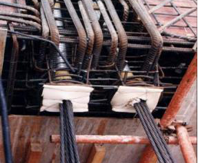 从波纹管一端套入锚垫板,并将其焊接于梁普通钢筋上,保证牢固。张拉端锚具之间的最小距离必须满足要求。锚垫板安装完成后,用棉纱钢丝球塞入锚垫板灌浆孔等重要部位(见图5),并利用胶带缠绕密封连接部位。