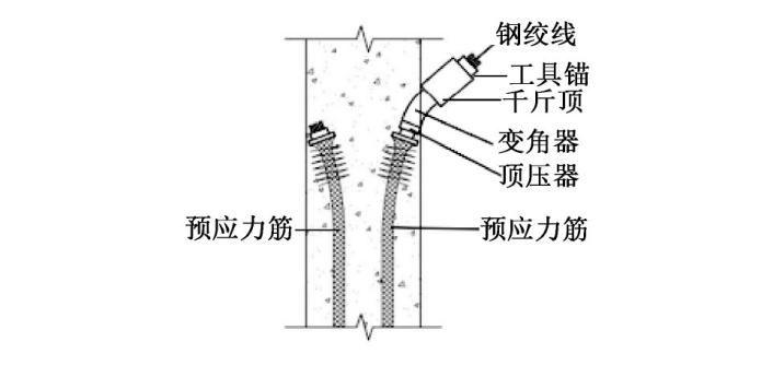 2)安装工作锚、变角块时,应注意变角块之间的槽口搭接,保证密实。当变角为10%~25%时,在原设计张拉控制应力的基础上超张拉2%~3%;变角为25%~40%时,在原设计张拉控制应力的基础上超张拉4%。