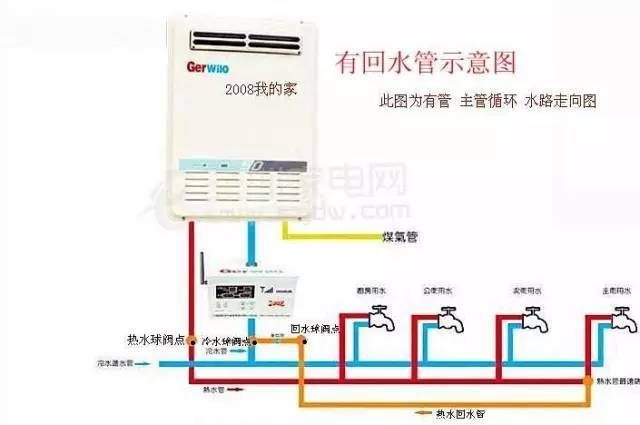 安装回水系统时须提前安装一套止回阀,回水系统工作时抽动管道内的冷水(热水管道内的冷水这时会由止回阀流向冷水管道,冷水管道内的水又流向热水器,这样就行程一个内循环)从而通过热水器来进行加热。机器工作时间可根据热水管道长度来设定。回水管道,就是从热水管的最远段再接回一条水管到热水器的下方,回来的这条水管就是我们常说的回水管。