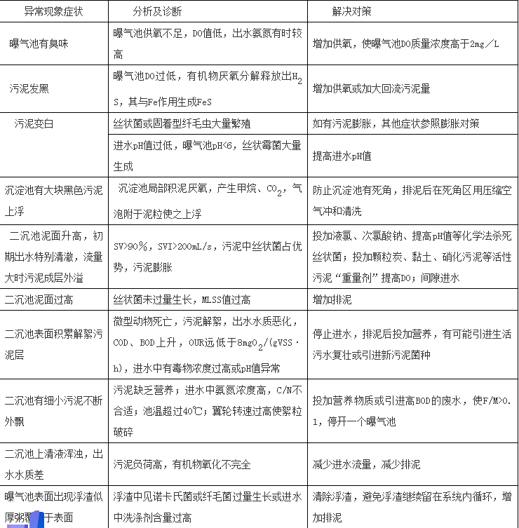综合上述,在污泥发生膨胀时,应及时改变曝气池中微生物所处的环境条件,在有两大类微生物菌胶团细菌和丝状菌共存并相互竞争的污泥体系中,创造适合于菌胶团细菌生长的环境条件,使丝状菌得不到优势生长,以达到改善污泥沉降压缩性能、控制或预防污泥膨胀的目的。下表为污泥性状异常及分析。