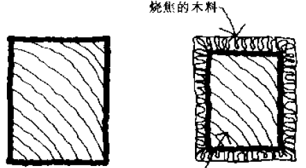 再次,当大块木料断面燃烧时,火把木材表层燃烧,烧焦率是知道的。烧焦断面里面的木料仍有结构强度。因此在失火期间,木杆件是由于几何构造的原因而失去强度的。反之,钢材的着火点虽然相对较高,但它的结构性能在温度达到550℃左右时发生变形,而这一温度在普通火中是非常寻常的。在这一温度下,钢失去大部分强度和刚度,并且不再能作为结构,变成了一堆废钢架。