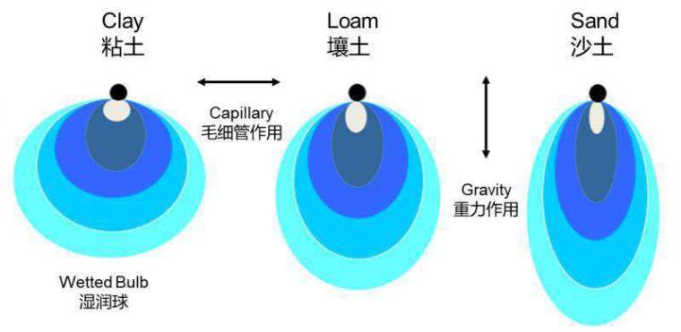 我们在用滴灌系统灌溉时,水从滴头处均匀缓慢地滴入土壤中,慢慢滴头下的水在地表下面形成湿润的球形区域 ,这称为湿润球。不同土壤质地中的水份移动不同,从而形成不同形状和大小的湿润区域。如果土壤的粘性弱,比如沙性土壤中,湿润球则纵向较长,湿润横向宽度约30-40厘米;如果土壤的粘性强,则土壤湿润球比横向长,宽度约为60-70厘米;壤土湿润球近似圆形,宽度经50-60厘米。